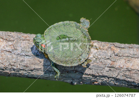 枯れ木の上で甲羅干しをするミドリガメ