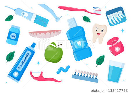 Oral care and hygiene products, dental cleaning tools icon set. Toothbrush, toothpaste, mouthwash, floss toothpick, dental floss, dental irrigator. Brushing teeth. Vector illustration.
