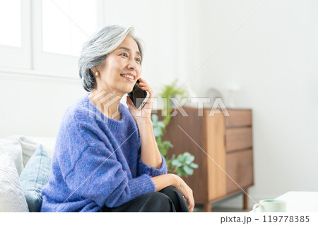 リビングで電話するシニア女性