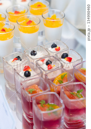 Delicious Layered Desserts in Clear Cups Displayed at a Festive Celebration Event