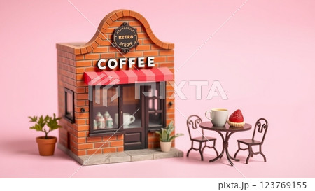 ピンクの背景にあるミニチュアのコーヒーショップ