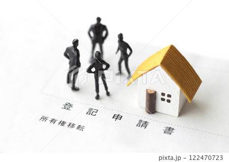 遺産相続のトラブルをミニチュア人形と家と文言で表現した写真