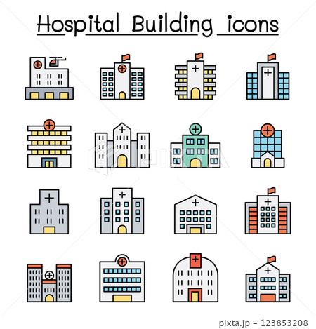 Hospital building icon set in flat color style