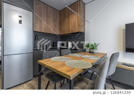 a modern bedroom in a stylish interior of a new apartment with designer renovation