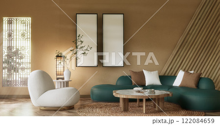 Mocha concept Scene living room have green sofa and decoration wooden minimalist design, room japanese style.3D rendering