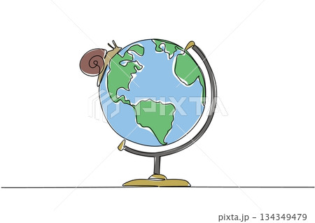 Single one line drawing snail walking on globe. Animals with a very wide distribution throughout the world. Has many habitats. Symbol. National Snail Day. Continuous line design graphic illustration