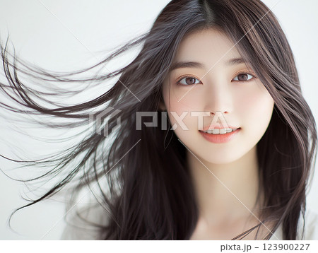 美しい女性の笑顔と風になびく長い髪のポートレート写真