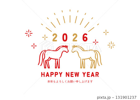 二頭の馬のシンプルな線画の年賀状(2026年午年)