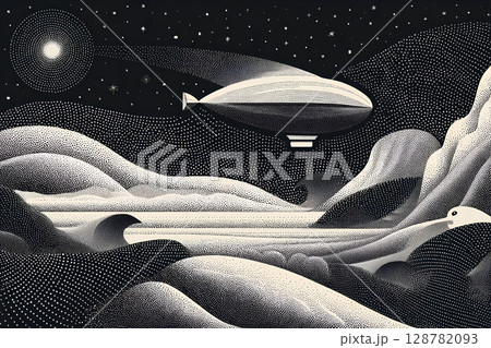 宇宙を飛ぶ飛行船の点描風モノクロイラスト