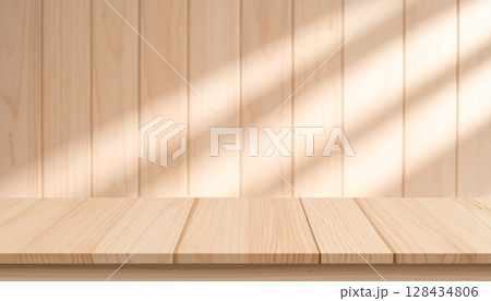 木のテーブルに差し込む日差しと影|ミニマルでナチュラルなインテリア背景