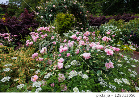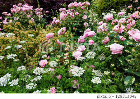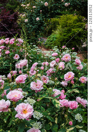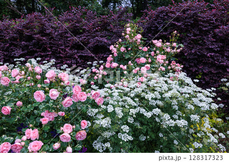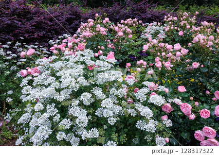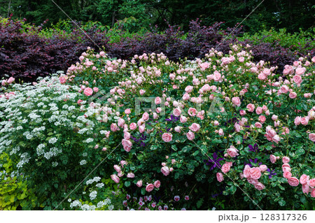 初夏のガーデンで美しく咲くピンク色のバラとオルレアの花