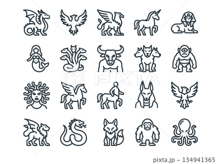 Set of 20 mythical creatures line icons. Vector illustration of dragon, phoenix, unicorn, mermaid, sphinx and other legendary beasts. Black outline style on white background.