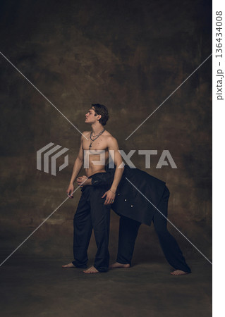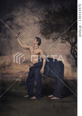 Shirtless man holding smartphone in surreal classical landscape with Minotaur body illusion