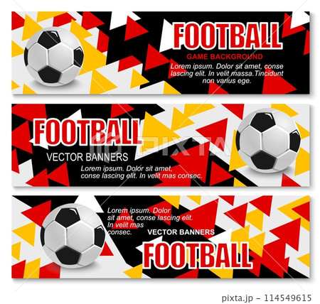 Germany euro soccer cup 2024 banners. Vector vibrant football-themed horizontal cards for tournament league championship, with realistic 3d soccer balls, and geometric shapes in colors of German flag