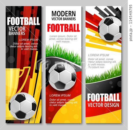 Germany euro soccer cup 2024 banners. Vector vibrant vertical football cards with realistic 3d soccer balls, bold red, black, yellow and white geometric triangles. Dynamic sports club or game layouts