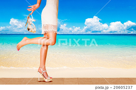 サンダルでビーチを歩く女性