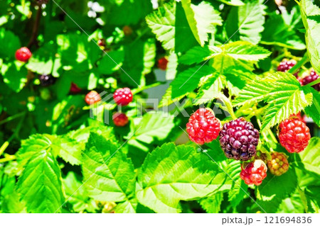 明るい庭で撮影された青々とした葉とボイセンベリーの熟した赤や紫の実、初夏