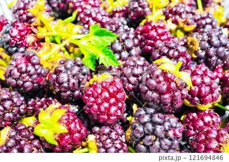 たくさんの赤や紫のボイセンベリーの熟した実のアップ