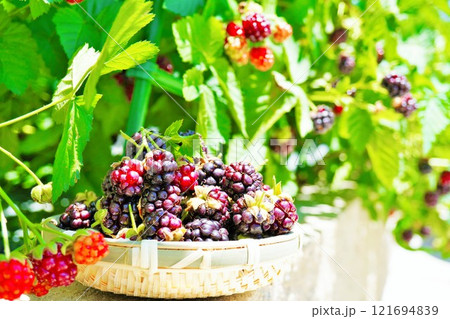 庭のボイセンベリーの青々とした葉を背景に摘み取られた籠いっぱいの実