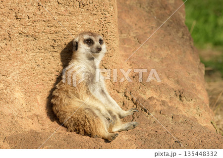 春の訪れで壁にもたれてのんびりと日光浴を楽しむミーアキャット