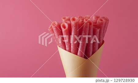 Sausage chicken beef grill or smoked on brown paper wrapped package in solid background