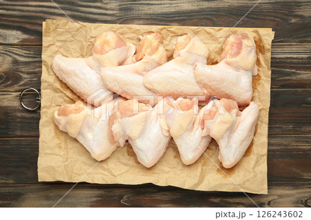 Raw chicken wings, on a wooden board, top view, no people,