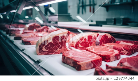 Fresh raw beef cuts neatly arranged in a refrigerated glass display case at a butcher shop