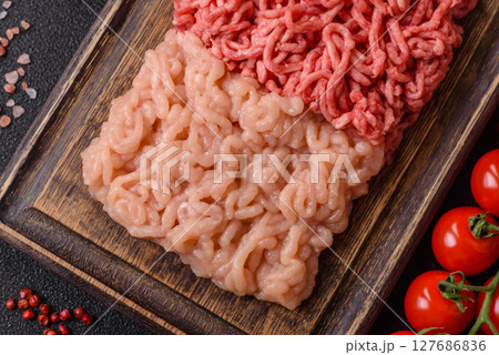 Beef and chicken minced meat, ground of two types fresh raw with salt and spices