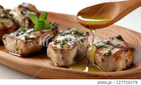 Succulent roasted pork ribs drizzled with mint and ginger sauce, served on a wooden plate for a delicious culinary experience