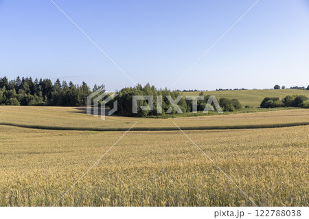 a field in the evening during the summer at sunset, production of agricultural rye plants closeup