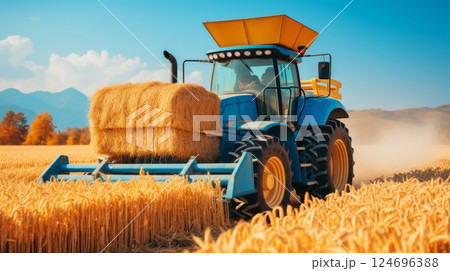 Ripe wheat field harvest panorama with agricultural machinery in scenic countryside