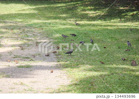 旧芝離宮恩賜庭園の芝生で採餌するスズメとムクドリ
