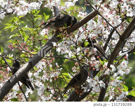 桜の木で花の蜜をついばむムクドリの群れ