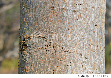 ムクノキと推定される高木の幹をアップで春に撮影した写真