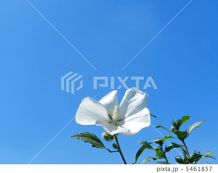 青空と木々の葉を背景に真っ白な一重の花を咲かせているムクゲ。