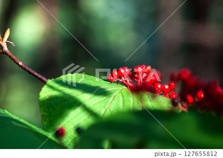 埼玉県嵐山町 紅葉の武蔵嵐山渓谷の赤い実の付くオオカメノキ
