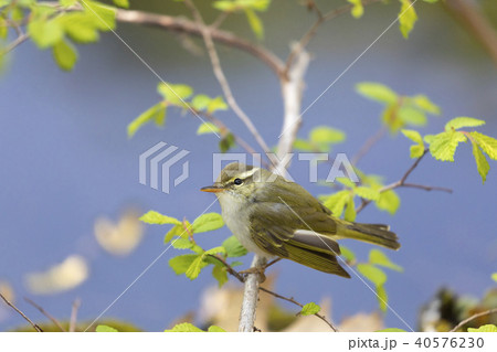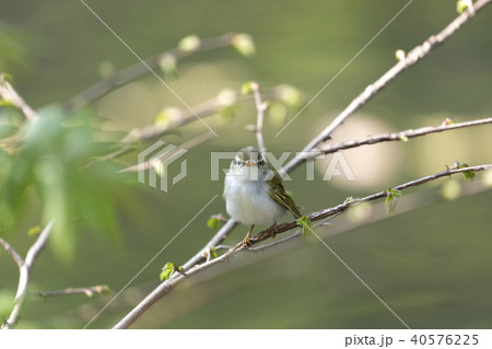 春に日本の雑木林や高原の森に渡来する小さな緑色の小鳥、センダイムシクイ