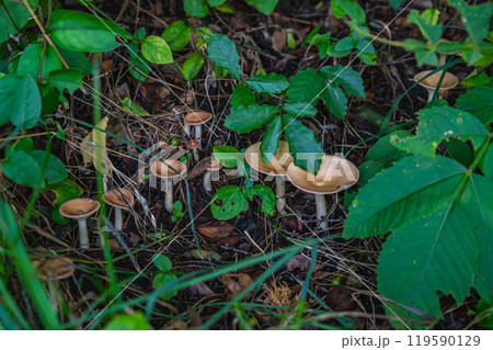 ひっそりとはえるキノコ「サクラタケ」(山梨県富士吉田市)