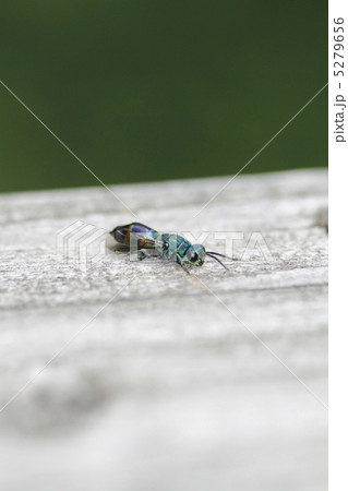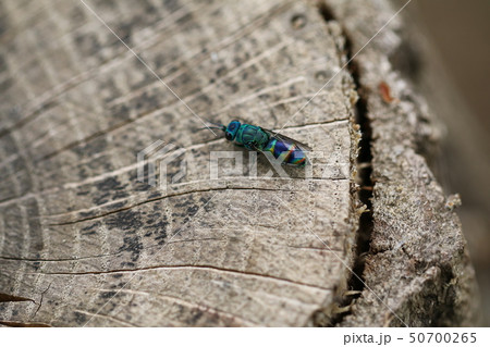 生き物 昆虫 ムツバセイボウ、朽木の穴に産卵に来る宿虫(ヤマトフタスジスズバチ)を待ち伏せ