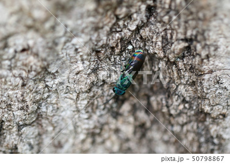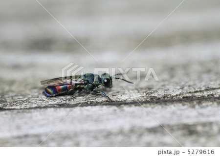 生き物 昆虫 ムツバセイボウ、金属光沢の虹色のハチ。ざらついた肌の粒々が一つづつ輝いています