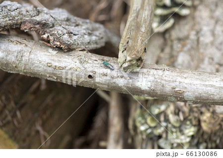 生き物 昆虫 ムツバセイボウ、朽木に開いたオナガバチ類の羽化後の巣穴を丹念にチェック