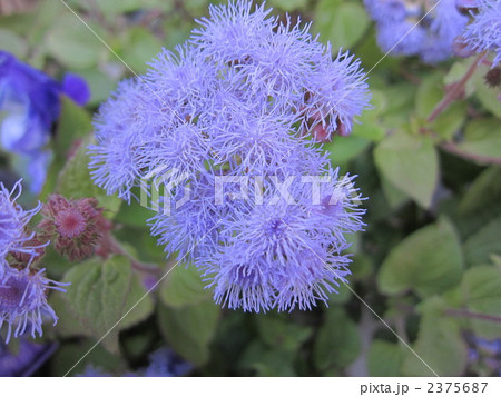 Floss violet flower (Ageratum houstonianum) park. Ageratum garden violet flower closeup.
