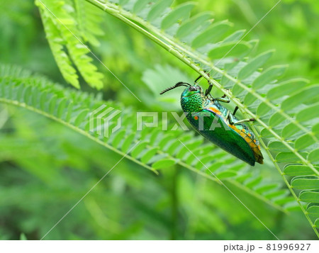 Green-legged metallic or Jewel beetle or Metallic wood-boring beetle ( Sternocera aequisignata ) on leaf tree plamt with natural green background , Yellow fur and orange round spot on body scarab