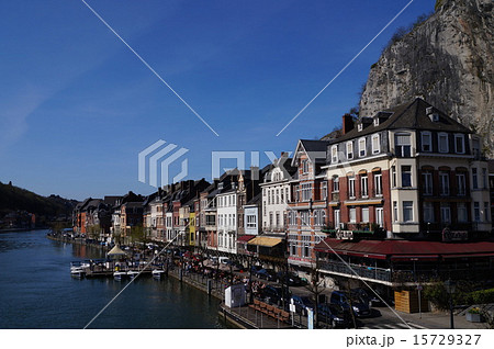 西ヨーロッパのベルギー ワロン地域ナミュール州の都市ディナン 町の中心を流れるムーズ川沿い早朝の景色