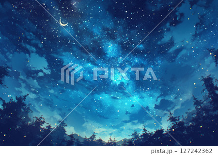夜空の背景と木のシルエットと月と星