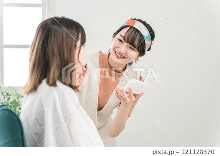 メイクさんにメイクされる女性(メイキャップアーティスト・メイクさん・美容部員・美容師)