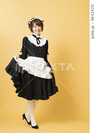 黒髪ロングヘアのメイド服の女性(全身)セット