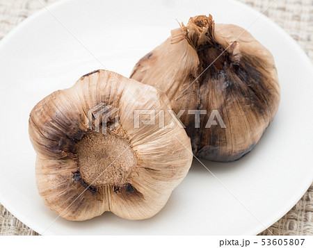 健康食品ヘルシー素材・熟成黒ニンニクの褐色の鱗茎(ニンニク球)と黒い鱗片・白バック縦位置