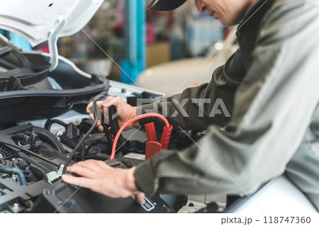 バッテリージャンプスターターを使う男性整備士・メカニックの手元