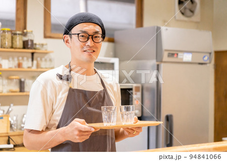 カフェのキッチンで水を持つ男性カフェスタッフ
